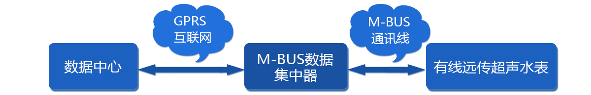 有線遠(yuǎn)傳方案由有線遠(yuǎn)傳超聲水表、M-bus(RS 485)通訊總線、M-bus(RS 485)數(shù)據(jù)集中器、數(shù)據(jù)中心組成。